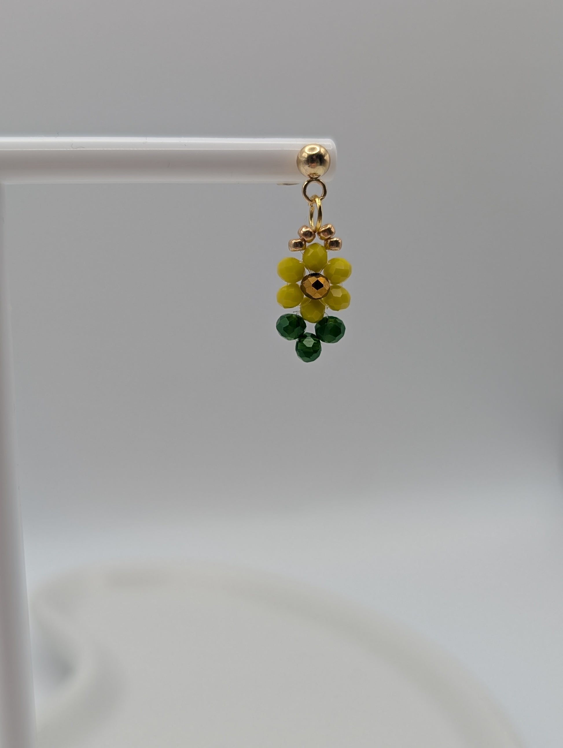 Zarte, handgemachte Sonnenblumen-Ohrringe aus gelben und grünen Perlen – leicht, fröhlich und perfekt für Frühling & Sommer.